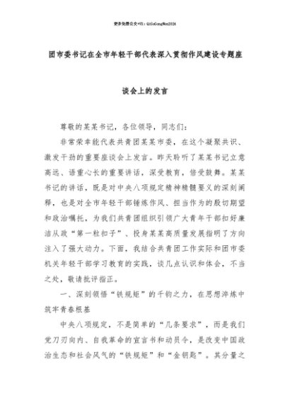 【七哥公文】2025年:【七哥公文】团市委书记在全市年轻干部代表深入贯彻作风建设专题座谈会上的发言+更多免费公文+VX:QiGeGongWen2024+更多免费公文+VX:QiGeGongWen2024