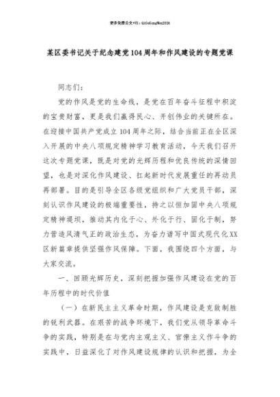 【七哥公文】2025年:【七哥公文】某区委书记关于纪念建党104周年和作风建设的专题党课+更多免费公文+VX:QiGeGongWen2024+更多免费公文+VX:QiGeGongWen2024