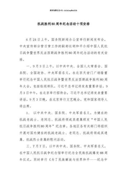 【七哥公文】2025年:【七哥公文】抗战胜利80周年纪念活动十项安排+更多免费公文+VX:QiGeGongWen2024+更多免费公文+VX:QiGeGongWen2024