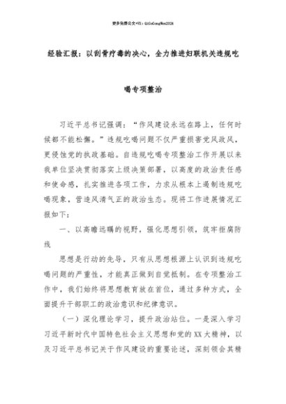 【七哥公文】2025年:【七哥公文】经验汇报:以刮骨疗毒的决心,全力推进妇联机关违规吃喝专项整治+更多免费公文+VX:QiGeGongWen2024+更多免费公文+VX:QiGeGongWen2024