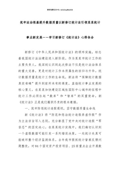 【七哥公文】2025年:【七哥公文】筑牢法治根基提升数据质量以新修订统计法引领某某统计事业新发展--学习新修订《统计法》心得体会+更多免费公文+VX:QiGeGongWen2024+更多免费公文+VX:QiGeGongWen2024