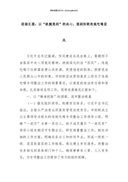 【七哥公文】2025年:【七哥公文】经验汇报:以“铁腕亮剑”的决心,狠刹妇联违规吃喝歪风+更多免费公文+VX:QiGeGongWen2024+更多免费公文+VX:QiGeGongWen2024