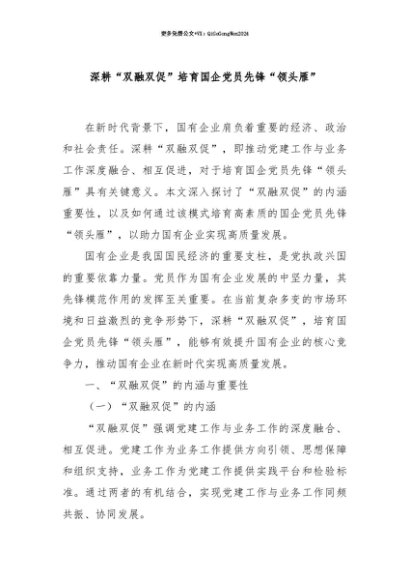 【七哥公文】2025年:【七哥公文】深耕“双融双促”培育国企党员先锋“领头雁”+更多免费公文+VX:QiGeGongWen2024+更多免费公文+VX:QiGeGongWen2024