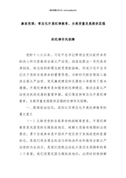 【七哥公文】2025年:【七哥公文】廉政党课:常态化开展纪律教育,为高质量发展提供坚强的纪律作风保障+更多免费公文+VX:QiGeGongWen2024+更多免费公文+VX:QiGeGongWen2024