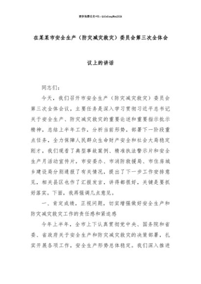 【七哥公文】2025年:【七哥公文】在某某市安全生产(防灾减灾救灾)委员会第三次全体会议上的讲话+更多免费公文+VX:QiGeGongWen2024+更多免费公文+VX:QiGeGongWen2024