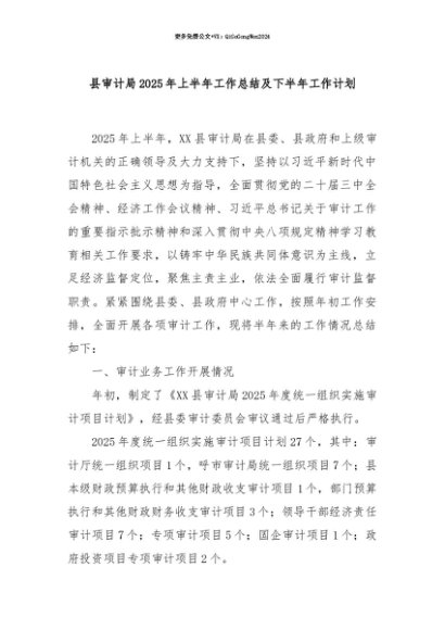 【七哥公文】2025年:【七哥公文】县审计局2025年上半年工作总结及下半年工作计划+更多免费公文+VX:QiGeGongWen2024+更多免费公文+VX:QiGeGongWen2024