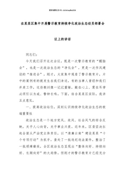 【七哥公文】2025年:【七哥公文】在某某区集中开展警示教育持续净化政治生态动员部署会议上的讲话+更多免费公文+VX:QiGeGongWen2024+更多免费公文+VX:QiGeGongWen2024