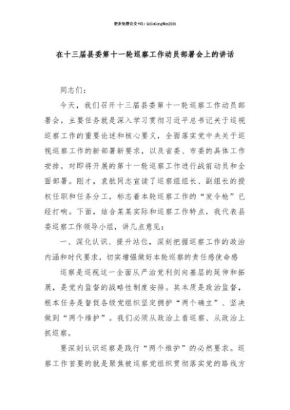 【七哥公文】2025年:【七哥公文】在十三届县委第十一轮巡察工作动员部署会上的讲话+更多免费公文+VX:QiGeGongWen2024+更多免费公文+VX:QiGeGongWen2024