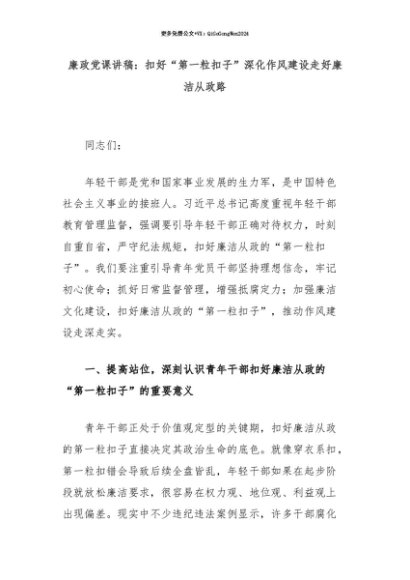 【七哥公文】2025年:【七哥公文】廉政党课讲稿:扣好“第一粒扣子”深化作风建设走好廉洁从政路+更多免费公文+VX:QiGeGongWen2024+更多免费公文+VX:QiGeGongWen2024