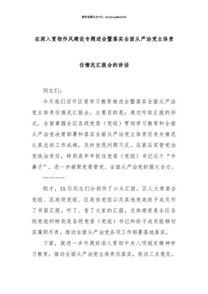 【七哥公文】2025年:【七哥公文】在深入贯彻作风建设专题进会暨落实全面从严治党主体责任情况汇报会的讲话+更多免费公文+VX:QiGeGongWen2024+更多免费公文+VX:QiGeGongWen2024