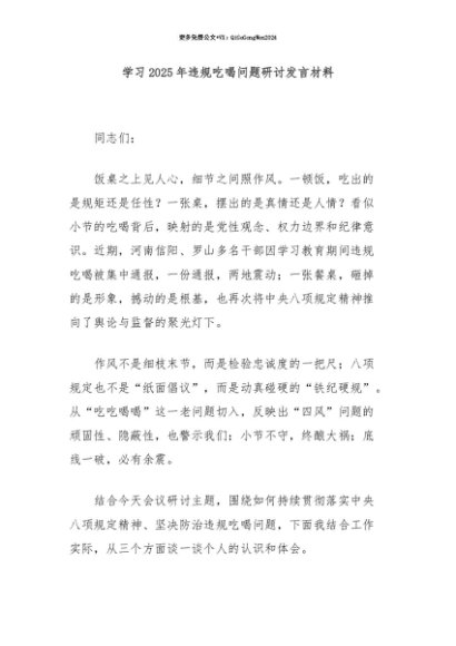 【七哥公文】2025年:【七哥公文】学习2025年违规吃喝问题研讨发言材料+更多免费公文+VX:QiGeGongWen2024+更多免费公文+VX:QiGeGongWen2024