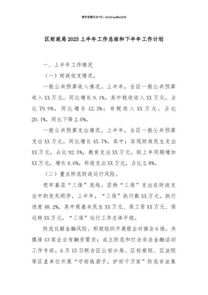 【七哥公文】2025年:【七哥公文】区财政局2025上半年工作总结和下半年工作计划+更多免费公文+VX:QiGeGongWen2024+更多免费公文+VX:QiGeGongWen2024