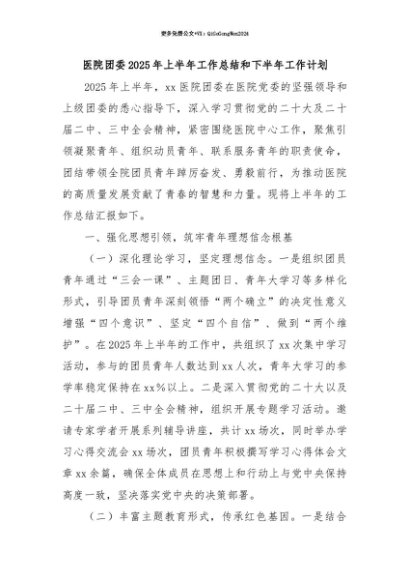 【七哥公文】2025年:【七哥公文】医院团委2025年上半年工作总结和下半年工作计划+更多免费公文+VX:QiGeGongWen2024+更多免费公文+VX:QiGeGongWen2024