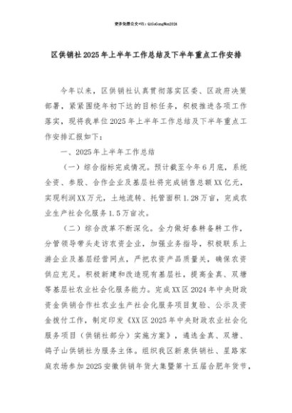 【七哥公文】2025年:【七哥公文】区供销社2025年上半年工作总结及下半年重点工作安排+更多免费公文+VX:QiGeGongWen2024+更多免费公文+VX:QiGeGongWen2024