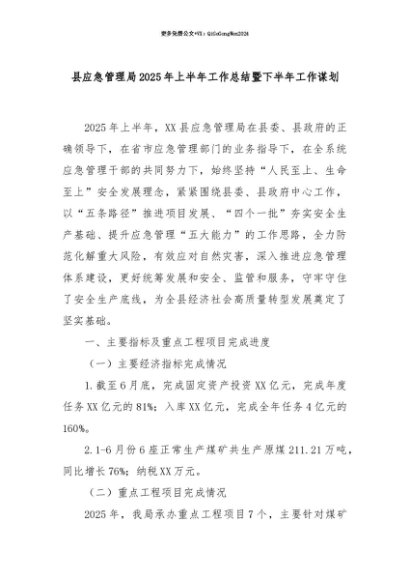【七哥公文】2025年:【七哥公文】县应急管理局2025年上半年工作总结暨下半年工作谋划+更多免费公文+VX:QiGeGongWen2024+更多免费公文+VX:QiGeGongWen2024