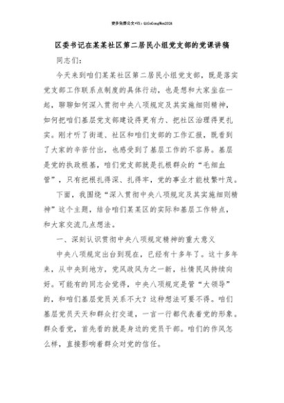 【七哥公文】2025年:【七哥公文】区委书记在某某社区第二居民小组党支部的党课讲稿+更多免费公文+VX:QiGeGongWen2024+更多免费公文+VX:QiGeGongWen2024