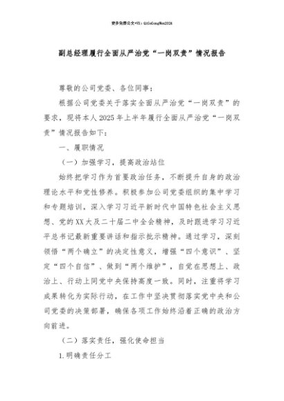 【七哥公文】2025年:【七哥公文】副总经理履行全面从严治党“一岗双责”情况报告+更多免费公文+VX:QiGeGongWen2024+更多免费公文+VX:QiGeGongWen2024