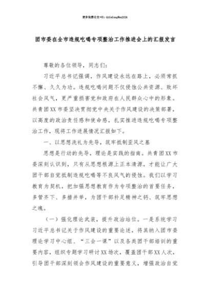 【七哥公文】2025年:【七哥公文】团市委在全市违规吃喝专项整治工作推进会上的汇报发言+更多免费公文+VX:QiGeGongWen2024+更多免费公文+VX:QiGeGongWen2024