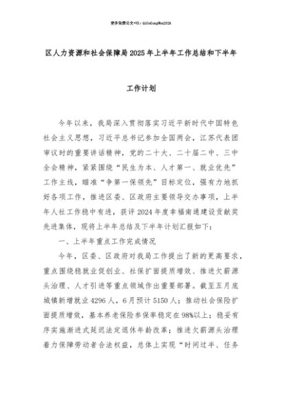【七哥公文】2025年:【七哥公文】区人力资源和社会保障局2025年上半年工作总结和下半年工作计划+更多免费公文+VX:QiGeGongWen2024+更多免费公文+VX:QiGeGongWen2024