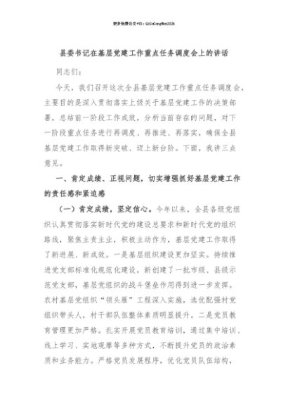 【七哥公文】2025年:【七哥公文】县委书记在基层党建工作重点任务调度会上的讲话+更多免费公文+VX:QiGeGongWen2024+更多免费公文+VX:QiGeGongWen2024