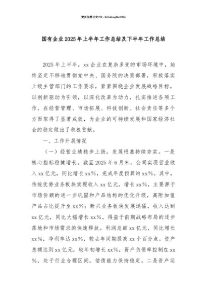 【七哥公文】2025年:【七哥公文】国有企业2025年上半年工作总结及下半年工作总结+更多免费公文+VX:QiGeGongWen2024+更多免费公文+VX:QiGeGongWen2024