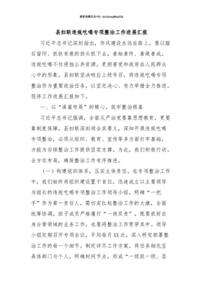 【七哥公文】2025年:【七哥公文】县妇联违规吃喝专项整治工作进展汇报+更多免费公文+VX:QiGeGongWen2024+更多免费公文+VX:QiGeGongWen2024