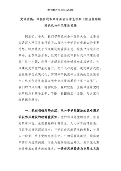 【七哥公文】2025年:【七哥公文】党课讲稿:深化自我革命永葆政治本色以实干担当筑牢新时代机关作风建设根基+更多免费公文+VX:QiGeGongWen2024+更多免费公文+VX:QiGeGongWen2024