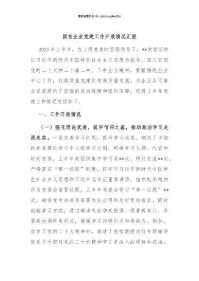 【七哥公文】2025年:【七哥公文】国有企业党建工作开展情况汇报+更多免费公文+VX:QiGeGongWen2024+更多免费公文+VX:QiGeGongWen2024