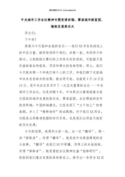 【七哥公文】2025年:【七哥公文】中央城市工作会议精神专题党课讲稿:擘画城市新蓝图,锤炼发展真功夫+更多免费公文+VX:QiGeGongWen2024+更多免费公文+VX:QiGeGongWen2024