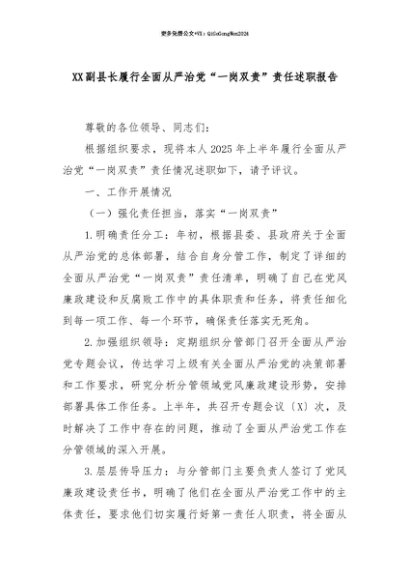 【七哥公文】2025年:【七哥公文】XX副县长履行全面从严治党“一岗双责”责任述职报告+更多免费公文+VX:QiGeGongWen2024+更多免费公文+VX:QiGeGongWen2024