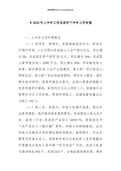 【七哥公文】2025年:【七哥公文】乡2025年上半年工作总结和下半年工作安排+更多免费公文+VX:QiGeGongWen2024+更多免费公文+VX:QiGeGongWen2024