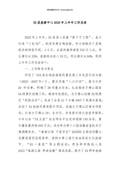【七哥公文】2025年:【七哥公文】XX县旅游中心2025年上半年工作总结+更多免费公文+VX:QiGeGongWen2024+更多免费公文+VX:QiGeGongWen2024