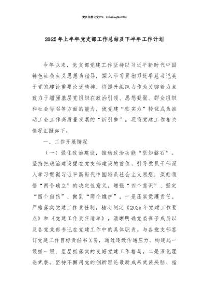 【七哥公文】2025年:【七哥公文】2025年上半年党支部工作总结及下半年工作计划+更多免费公文+VX:QiGeGongWen2024+更多免费公文+VX:QiGeGongWen2024