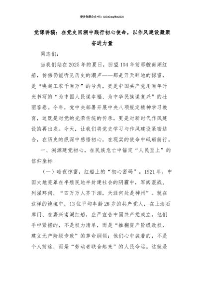 【七哥公文】2025年:【七哥公文】党课讲稿:在党史回溯中践行初心使命,以作风建设凝聚奋进力量+更多免费公文+VX:QiGeGongWen2024+更多免费公文+VX:QiGeGongWen2024