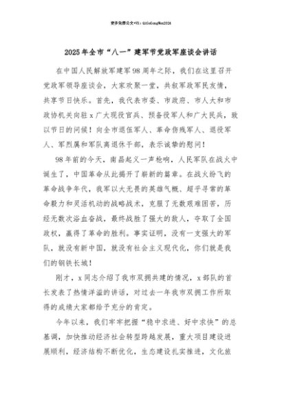 【七哥公文】2025年:【七哥公文】2025年全市“八一”建军节党政军座谈会讲话+更多免费公文+VX:QiGeGongWen2024+更多免费公文+VX:QiGeGongWen2024