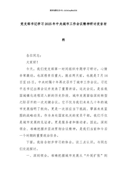 【七哥公文】2025年:【七哥公文】党支部书记学习2025年中央城市工作会议精神研讨发言材料+更多免费公文+VX:QiGeGongWen2024+更多免费公文+VX:QiGeGongWen2024