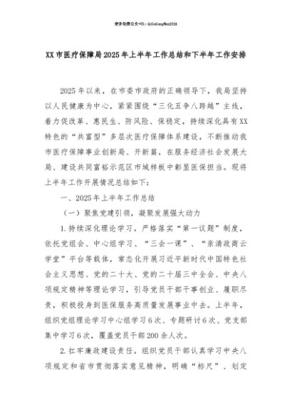 【七哥公文】2025年:【七哥公文】XX市医疗保障局2025年上半年工作总结和下半年工作安排+更多免费公文+VX:QiGeGongWen2024+更多免费公文+VX:QiGeGongWen2024