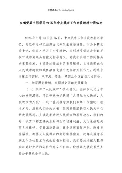 【七哥公文】2025年:【七哥公文】乡镇党委书记学习2025年中央城市工作会议精神心得体会+更多免费公文+VX:QiGeGongWen2024+更多免费公文+VX:QiGeGongWen2024