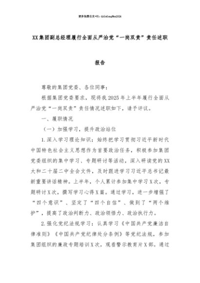 【七哥公文】2025年:【七哥公文】XX集团副总经理履行全面从严治党“一岗双责”责任述职报告+更多免费公文+VX:QiGeGongWen2024+更多免费公文+VX:QiGeGongWen2024