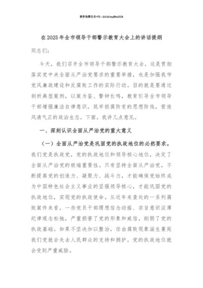 【七哥公文】2025年:【七哥公文】在2025年全市领导干部警示教育大会上的讲话提纲+更多免费公文+VX:QiGeGongWen2024+更多免费公文+VX:QiGeGongWen2024