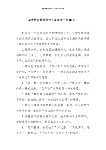 【七哥公文】2025年:【七哥公文】工作状态类排比句(2025年7月18日)+更多免费公文+VX:QiGeGongWen2024+更多免费公文+VX:QiGeGongWen2024