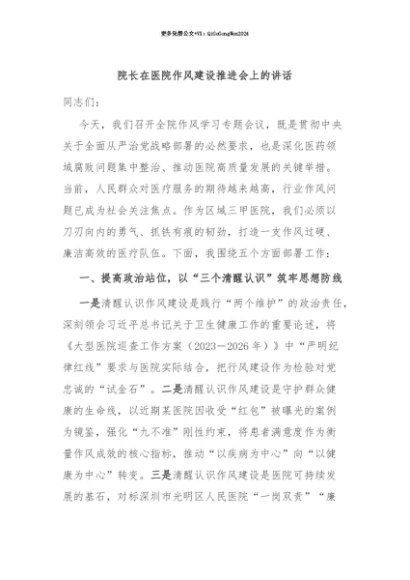 【七哥公文】2025年:【七哥公文】院长在医院作风建设推进会上的讲话+更多免费公文+VX:QiGeGongWen2024+更多免费公文+VX:QiGeGongWen2024