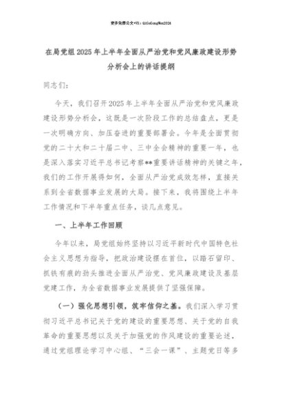 【七哥公文】2025年:【七哥公文】在局党组2025年上半年全面从严治党和党风廉政建设形势分析会上的讲话提纲+更多免费公文+VX:QiGeGongWen2024+更多免费公文+VX:QiGeGongWen2024