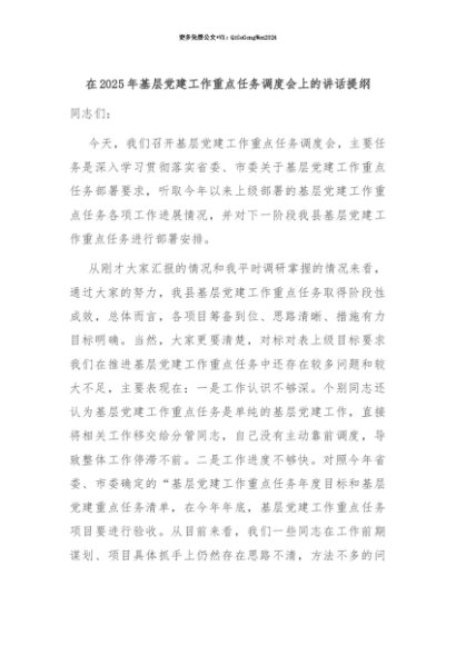 【七哥公文】2025年:【七哥公文】在2025年基层党建工作重点任务调度会上的讲话提纲+更多免费公文+VX:QiGeGongWen2024+更多免费公文+VX:QiGeGongWen2024