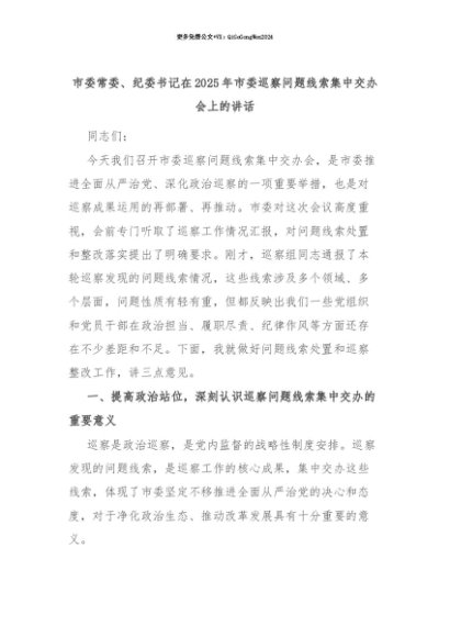 【七哥公文】2025年:【七哥公文】市委常委、纪委书记在2025年市委巡察问题线索集中交办会上的讲话+更多免费公文+VX:QiGeGongWen2024+更多免费公文+VX:QiGeGongWen2024
