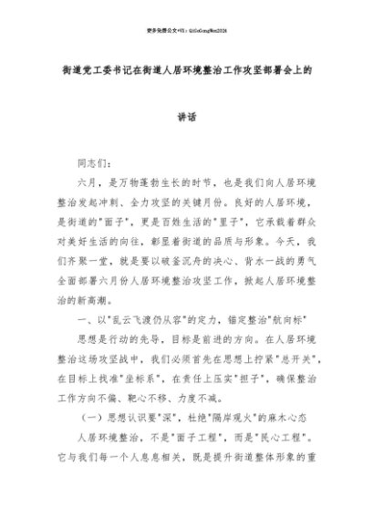 【七哥公文】2025年:【七哥公文】街道党工委书记在街道人居环境整治工作攻坚部署会上的讲话+更多免费公文+VX:QiGeGongWen2024+更多免费公文+VX:QiGeGongWen2024
