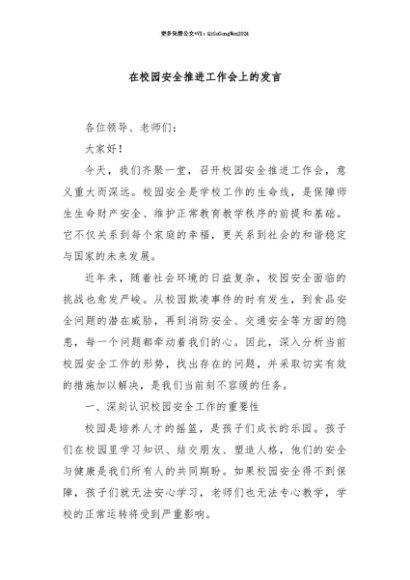 【七哥公文】2025年:【七哥公文】在校园安全推进工作会上的发言+更多免费公文+VX:QiGeGongWen2024+更多免费公文+VX:QiGeGongWen2024
