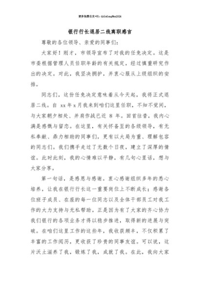 【七哥公文】2025年:【七哥公文】银行行长退居二线离职感言+更多免费公文+VX:QiGeGongWen2024+更多免费公文+VX:QiGeGongWen2024