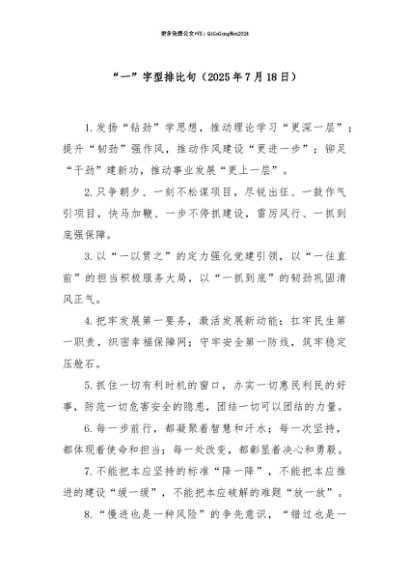 【七哥公文】2025年:【七哥公文】“一”字型排比句(2025年7月18日)+更多免费公文+VX:QiGeGongWen2024+更多免费公文+VX:QiGeGongWen2024