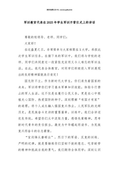 【七哥公文】2025年:【七哥公文】军训教官代表在2025年学生军训开营仪式上的讲话+更多免费公文+VX:QiGeGongWen2024+更多免费公文+VX:QiGeGongWen2024